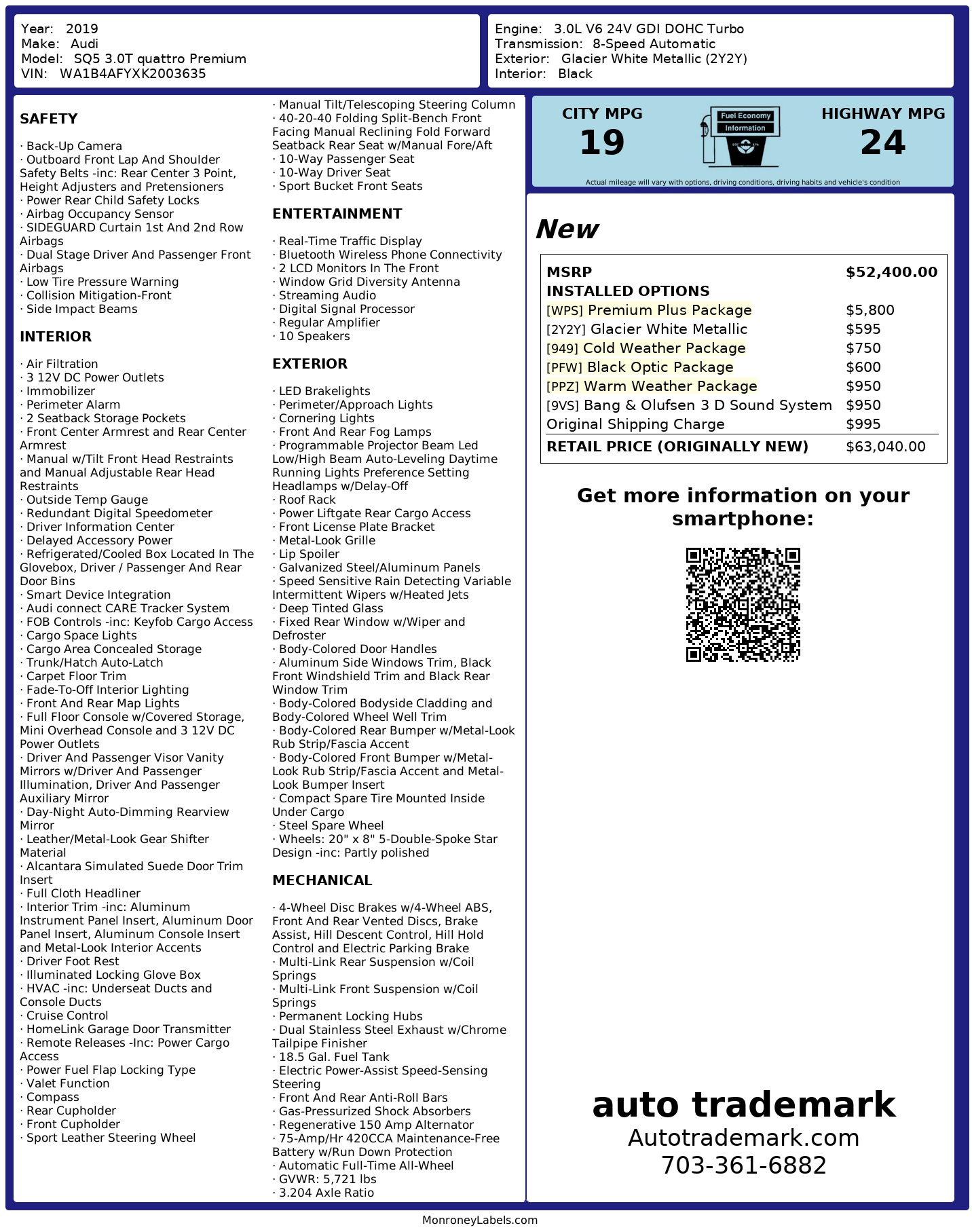 - Call 703-361-6882, Well Maintained, New Tires All Around, 3.0T Quattro Premium Plus Pkg, White w Titanium Black Exterior Leather Trim Interior, Black Optic Pkg, Cold Weather Pkg, Navigation System, Blind Spot Monitor, Panoramic Sunroof, Bang & Olufsen Audio, 20 Inch Wheels, Android & Apple Carplay Front Heated And Cooled Seats, Rear Seat Heated Heated Steering Wheel, AWD, ABS Brakes, Air Conditioning, Alloy Wheels, AM/FM Stereo, Automatic Transmission, Auxiliary Audio Input, Blind Spot Monitor, Bluetooth Technology, CD Audio, Cruise Control, Front Seat Heaters, Leather Seats, Memory Seat(s), Overhead Airbags, Power Hatch/Deck Lid, Power Locks, Power Mirrors, Power Seat(s), Power Windows, Rear Defroster, Rear View Camera, Satellite Radio Ready, Side Airbags, Smart Key, Traction Control, Turbo Charged Engine, Financing And Extended Service Plans Available. Online price includes military discount.