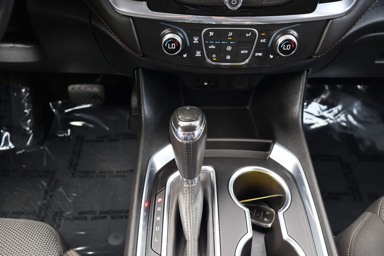 - Console, front center with 2 cup holders, covered storage bin with storage and removable tray